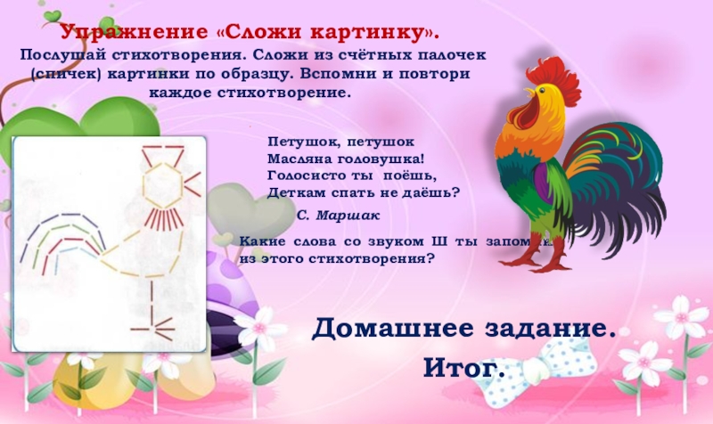Послушай стихотворения. Сложи из счётных палочек (спичек) картинки по образцу. Вспомни и повтори каждое стихотворение.