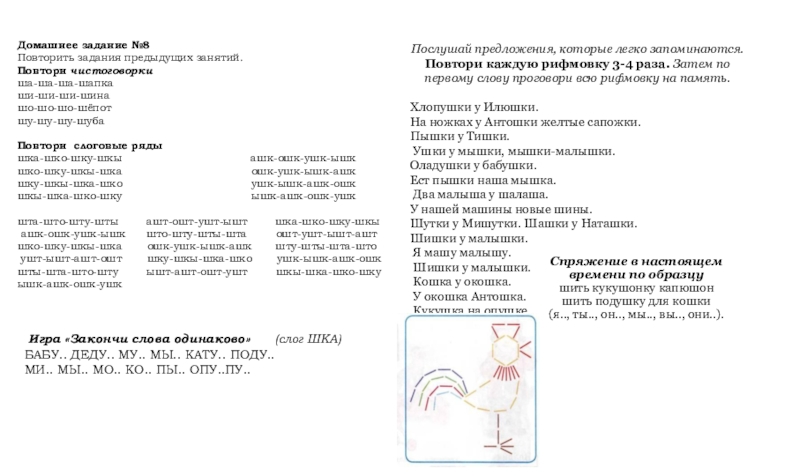 Послушай предложения, которые легко запоминаются. Повтори каждую рифмовку 3-4 раза. Затем по первому слову проговори всю рифмовку на память.