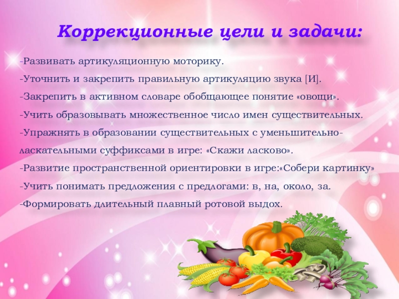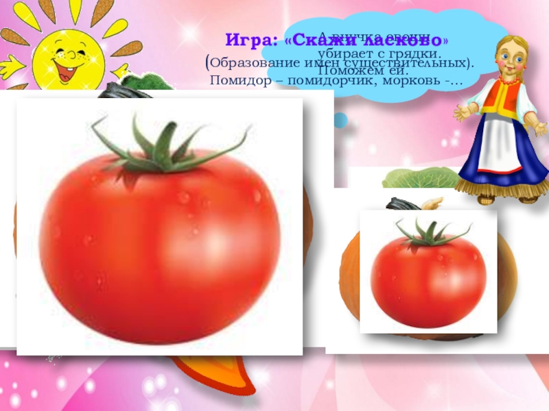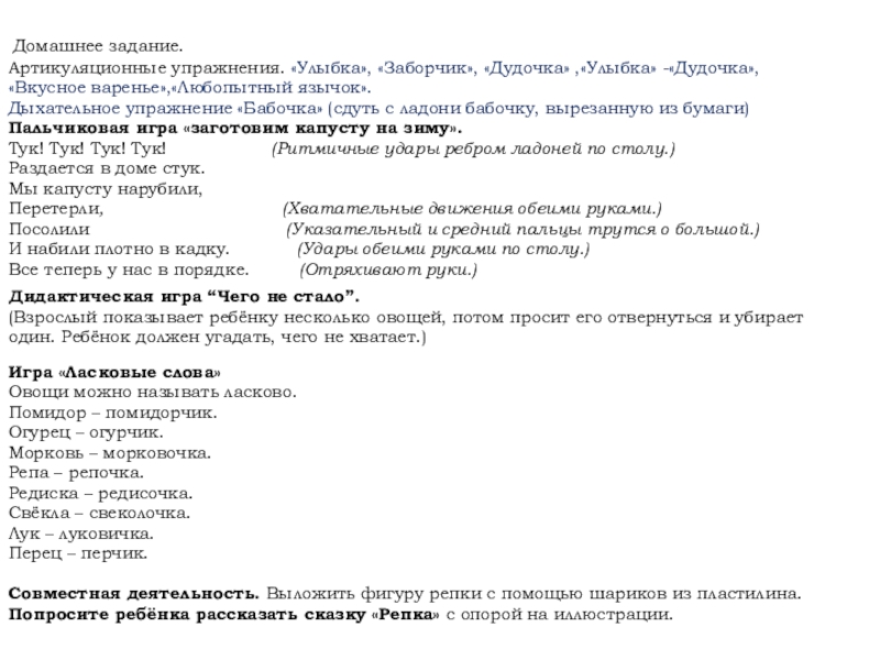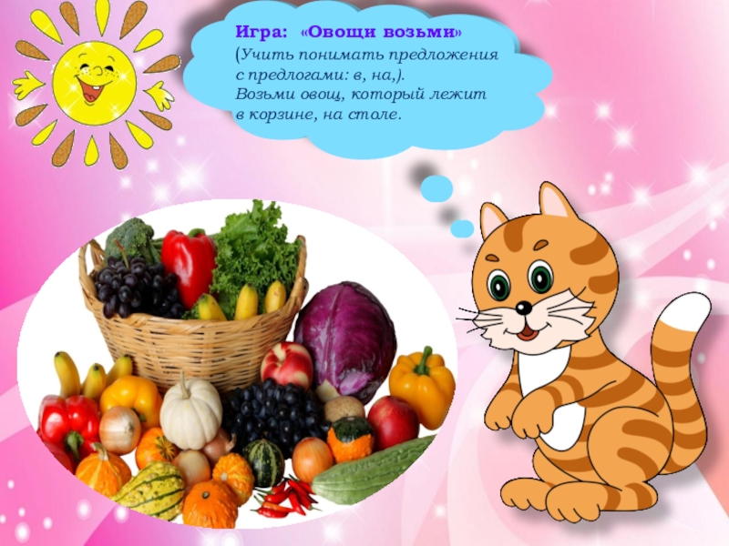 (Взрослый показывает ребёнку несколько овощей, потом просит его отвернуться и убирает один. Ребёнок должен угадать, чего не хватает.)