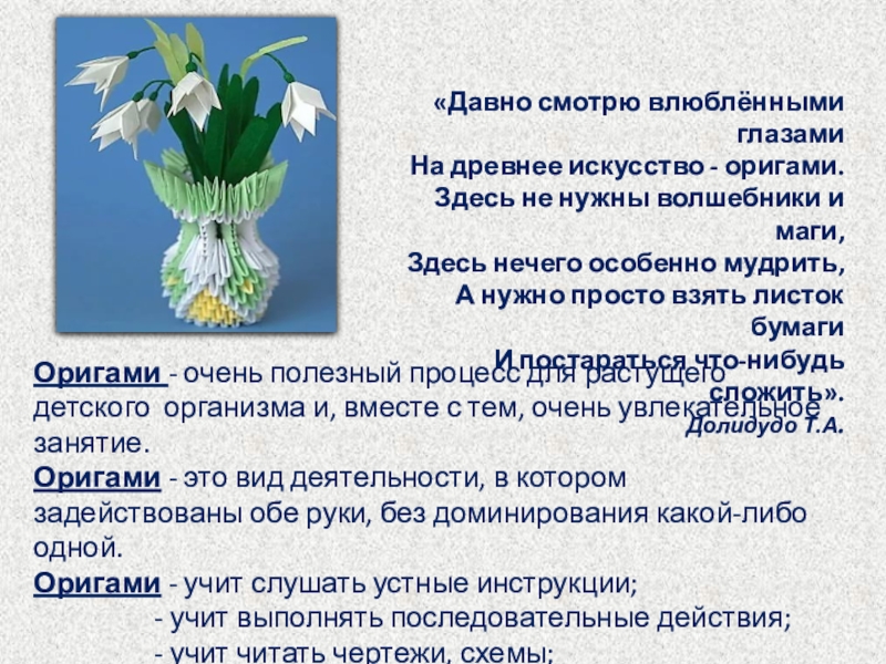 Оригами - очень полезный процесс для растущего детского организма и, вместе с тем, очень увлекательное занятие.