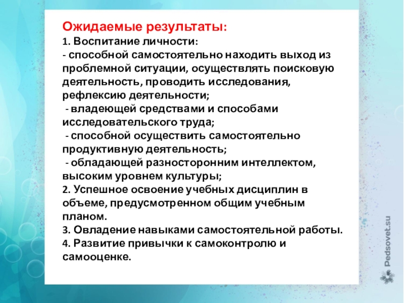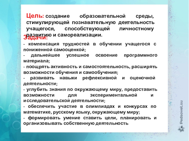 Цель: создание образовательной среды, стимулирующей познавательную деятельность учащегося, способствующей личностному развитию и самореализации.