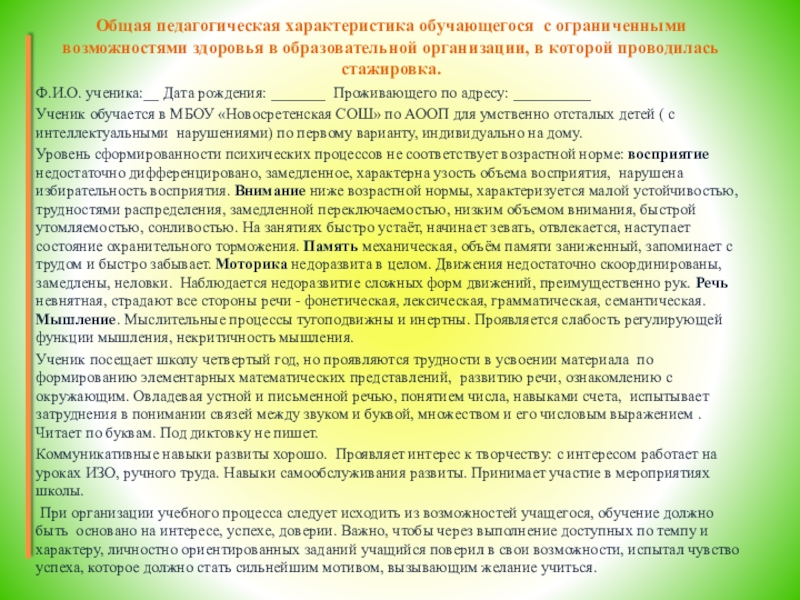 Ученик обучается в МБОУ «Новосретенская СОШ» по АООП для умственно отсталых детей ( с интеллектуальными нарушениями) по первому варианту, индивидуально на дому.