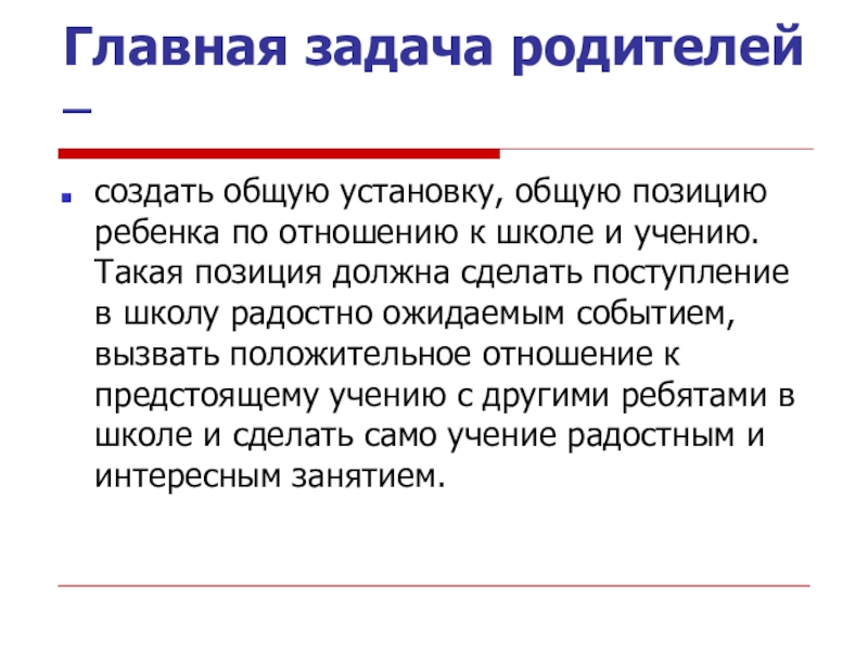 отношению к школе и учению. Такая позиция должна сделать поступление в школу радостно ожидаемым событием, вызвать положительное отношение к предстоящему учению с другими ребятами в школе и сделать само учение радостным и интересным занятием.