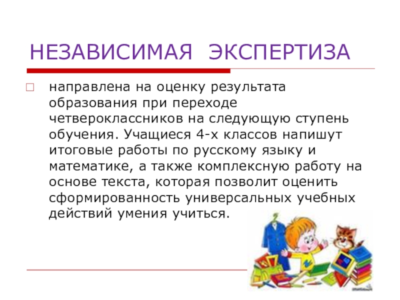 ступень обучения. Учащиеся 4-х классов напишут итоговые работы по русскому языку и математике, а также комплексную работу на основе текста, которая позволит оценить сформированность универсальных учебных действий умения учиться.