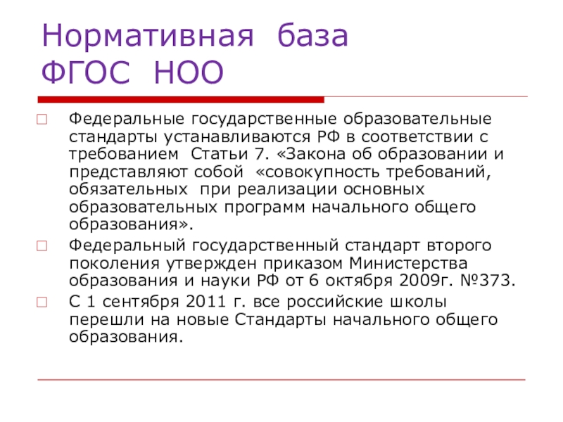 Федеральный государственный стандарт второго поколения утвержден приказом Министерства образования и науки РФ от 6 октября 2009г. №373.