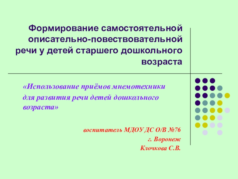 Формирование самостоятельной описательно-повествовательной речи у детей старшего дошкольного возраста«Использование приёмов мнемотехники для развития речи детей дошкольного возраста» воспитатель