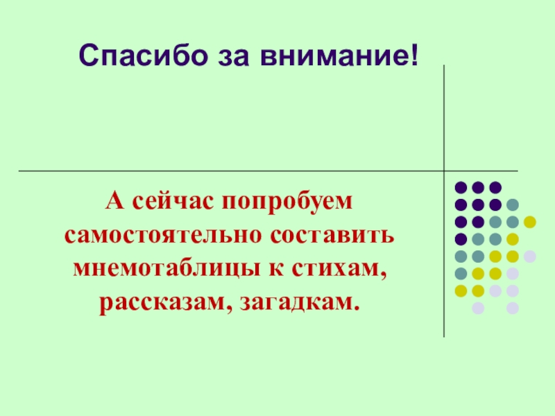 Спасибо за внимание!А сейчас попробуем самостоятельно составить мнемотаблицы к стихам, рассказам, загадкам.