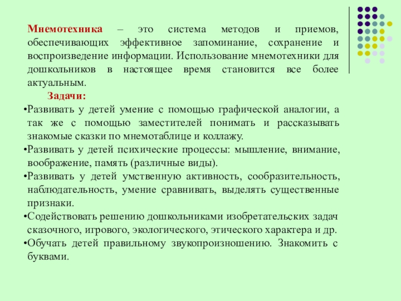 Мнемотехника – это система методов и приемов, обеспечивающих эффективное запоминание, сохранение и воспроизведение информации. Использование мнемотехники для