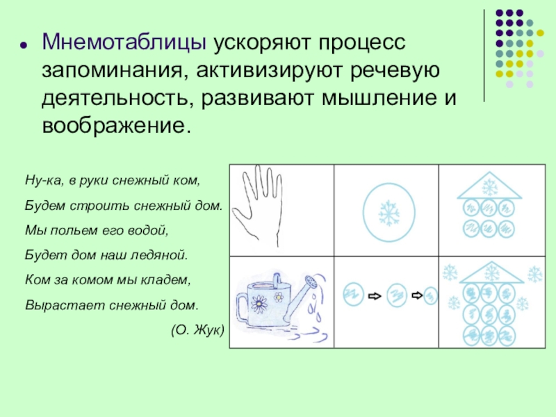 Мнемотаблицы ускоряют процесс запоминания, активизируют речевую деятельность, развивают мышление и воображение.Ну-ка, в руки снежный ком,Будем строить снежный