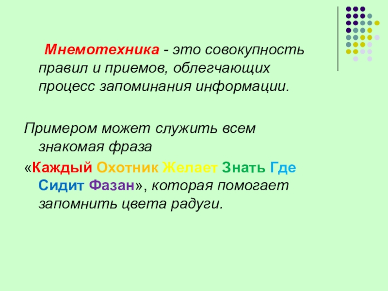 Мнемотехника - это совокупность правил и приемов, облегчающих процесс запоминания информации. Примером может служить всем знакомая фраза«Каждый Охотник Желает Знать Где Сидит Фазан», которая помогает запомнить цвета радуги.