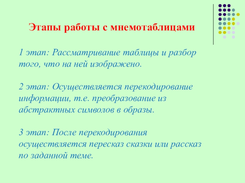 Этапы работы с мнемотаблицами1 этап: Рассматривание таблицы и разбор того, что на ней изображено. 2 этап: Осуществляется