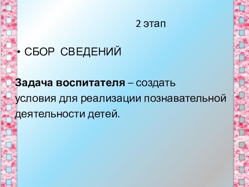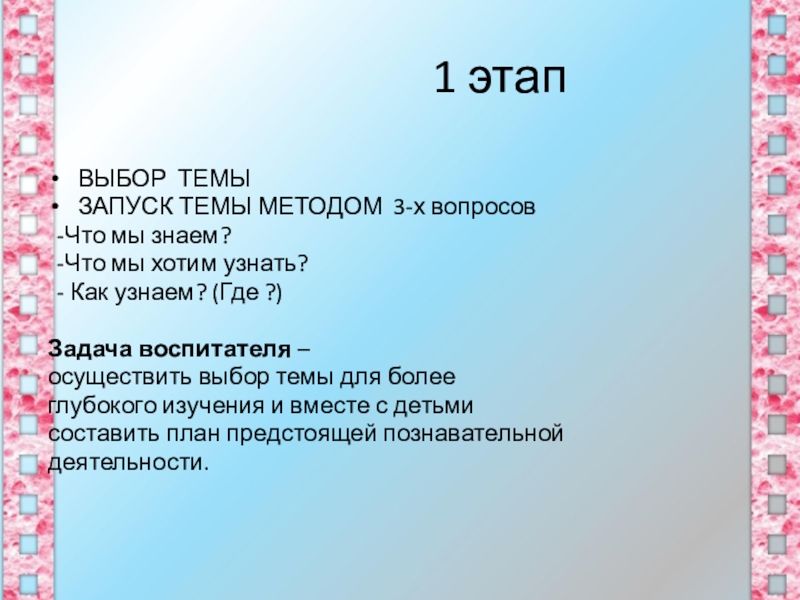 - педагог и дети договариваются о форме представления результатов (сказка, фильм, праздник, концерт, панно и т.д.);