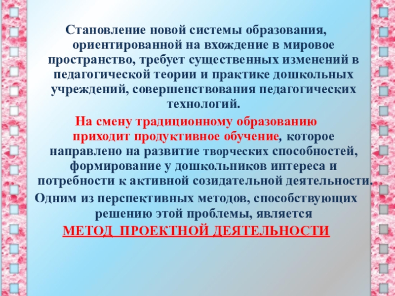 существенных изменений в педагогической теории и практике дошкольных учреждений, совершенствования педагогических технологий.