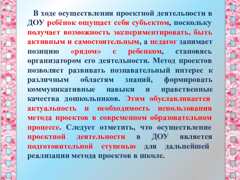 ощущает себя субъектом, поскольку получает возможность экспериментировать, быть активным и самостоятельным, а педагог занимает позицию «рядом» с ребенком, становясь организатором его деятельности. Метод проектов позволяет развивать познавательный интерес к различным областям знаний, формировать коммуникативные навыки и нравственные качества дошкольников. Этим обуславливается актуальность и необходимость использования метода проектов в современном образовательном процессе. Следует отметить, что осуществление проектной деятельности в ДОУ является подготовительной ступенью для дальнейшей реализации метода проектов в школе.