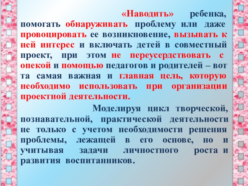 возникновение, вызывать к ней интерес и включать детей в совместный проект, при этом не переусердствовать с опекой и помощью педагогов и родителей – вот та самая важная и главная цель, которую необходимо использовать при организации проектной деятельности.