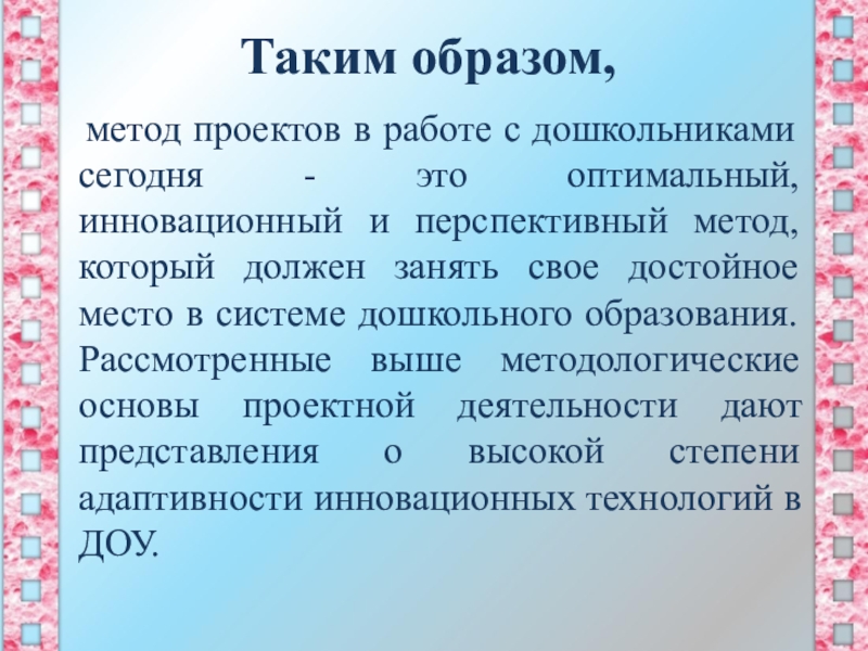 - это оптимальный, инновационный и перспективный метод, который должен занять свое достойное место в системе дошкольного образования. Рассмотренные выше методологические основы проектной деятельности дают представления о высокой степени адаптивности инновационных технологий в ДОУ.