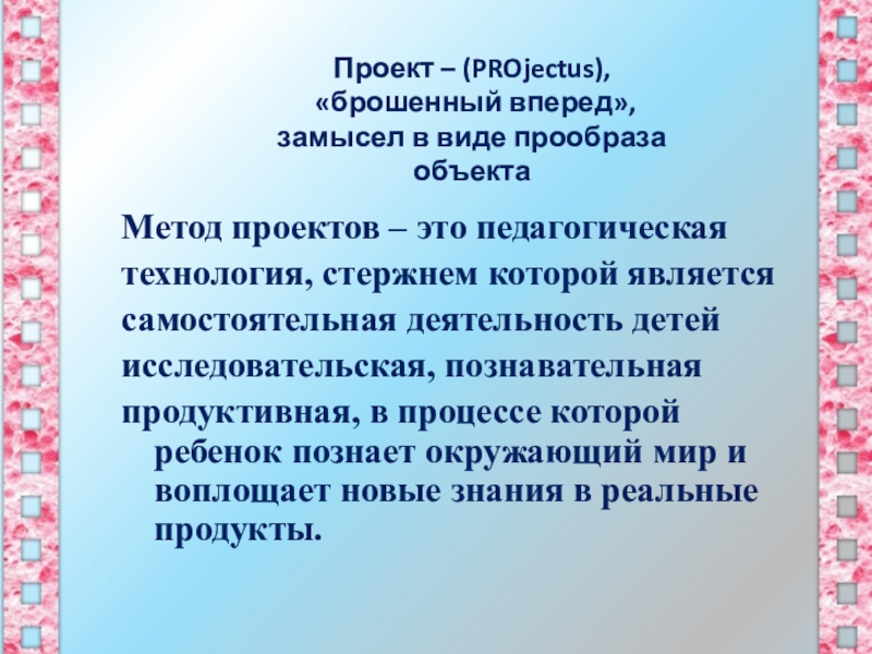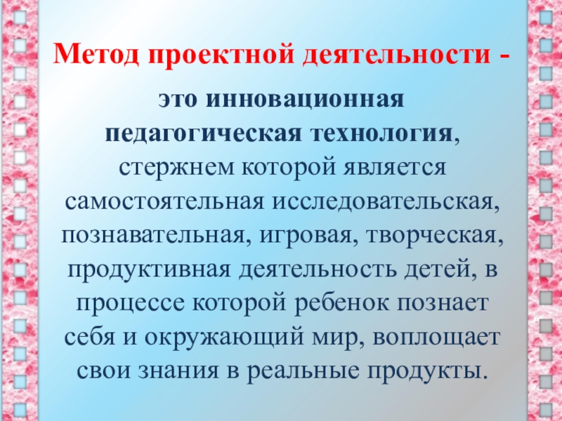 которой является самостоятельная исследовательская, познавательная, игровая, творческая, продуктивная деятельность детей, в процессе которой ребенок познает себя и окружающий мир, воплощает свои знания в реальные продукты.