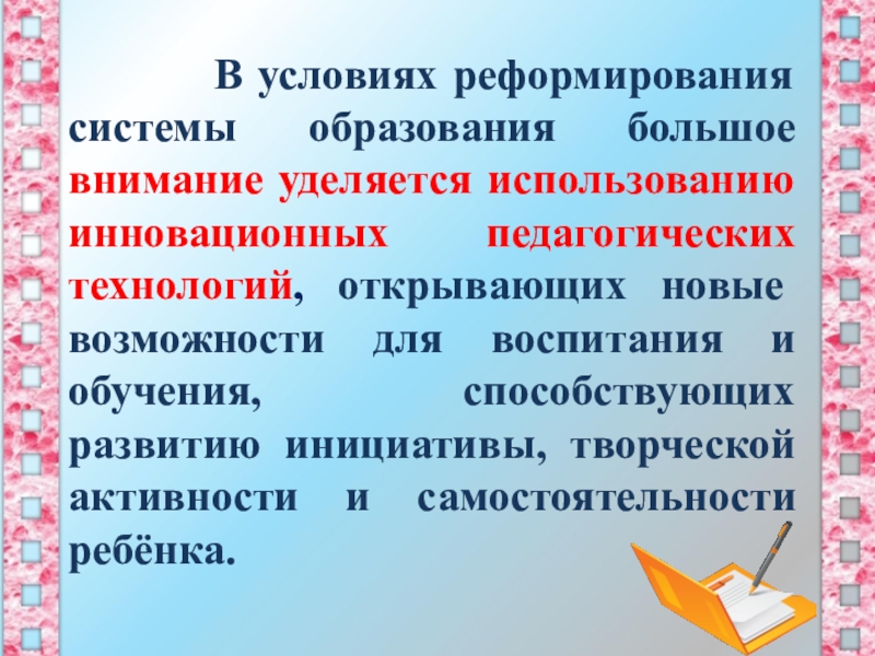 большое внимание уделяется использованию инновационных педагогических технологий, открывающих новые возможности для воспитания и обучения, способствующих развитию инициативы, творческой активности и самостоятельности ребёнка.