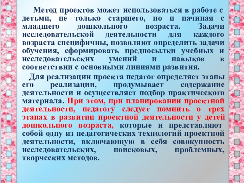 Для реализации проекта педагог определяет этапы его реализации, продумывает содержание деятельности и осуществляет подбор практического материала. При этом, при планировании проектной деятельности, педагогу следует помнить о трех этапах в развитии проектной деятельности у детей дошкольного возраста, которые и представляют собой одну из педагогических технологий проектной деятельности, включающую в себя совокупность исследовательских, поисковых, проблемных, творческих методов.