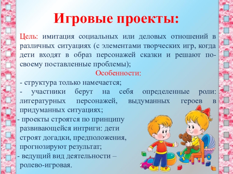 Именно посредством игры вводится проблемная ситуация, а затем осуществляется реализация самого детского проекта.