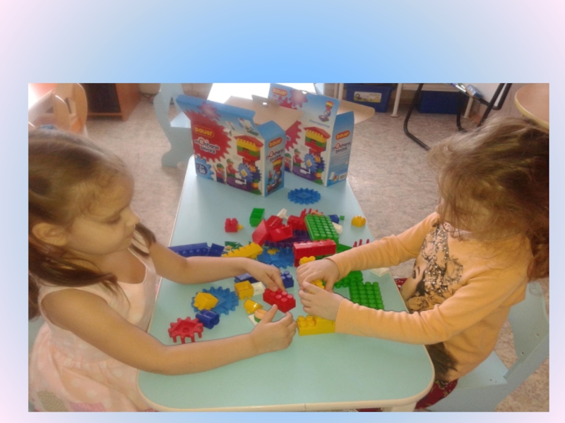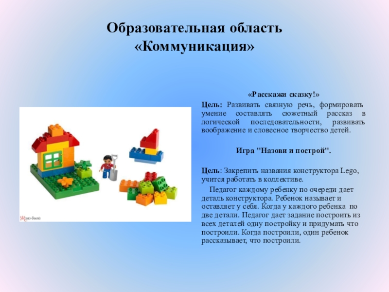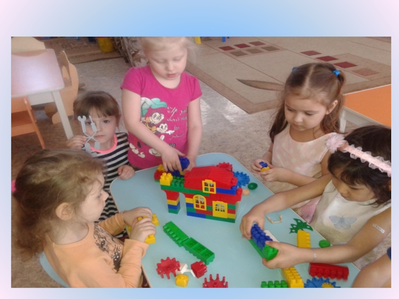 Педагог каждому ребенку по очереди дает деталь конструктора. Ребенок называет и оставляет у себя. Когда у каждого ребенка по две детали. Педагог дает задание построить из всех деталей одну постройку и придумать что построили. Когда построили, один ребенок рассказывает, что построили.