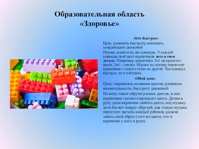 команды. У каждой команды свой цвет кирпичиков лего и своя деталь. Например, кирпичики 2х2 см красного цвета, 2х4 – синего. Игроки по одному переносят кирпичики с одного стола на другой. Чья команда быстрее, та и победила.