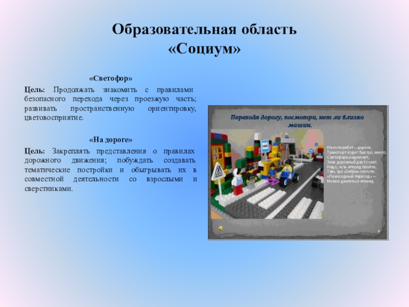 Цель: Закреплять представления о правилах дорожного движения; побуждать создавать тематические постройки и обыгрывать их в совместной деятельности со взрослыми и сверстниками.
