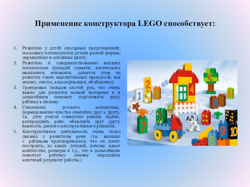 Развитию у детей сенсорных представлений, поскольку используются детали