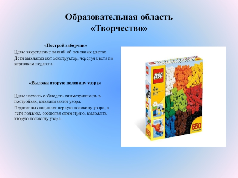 Цель: Закрепить названия конструктора Lego, учится работать в коллективе.