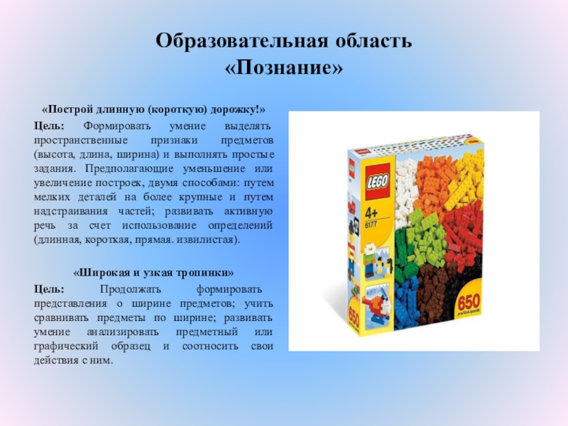(высота, длина, ширина) и выполнять простые задания. Предполагающие уменьшение или увеличение построек, двумя способами: путем мелких деталей на более крупные и путем надстраивания частей; развивать активную речь за счет использование определений (длинная, короткая, прямая. извилистая).