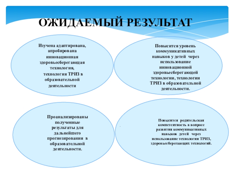 Повысится уровень коммуникативных навыков у детей через использование инновационной здоровьесберегающей технологии, технологии ТРИЗ в образовательной деятельности.