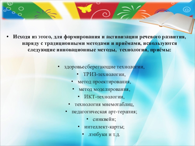 Исходя из этого, для формирования и активизации речевого развития, наряду с традиционными методами и приёмами, используются следующие инновационные методы, технологии, приёмы: