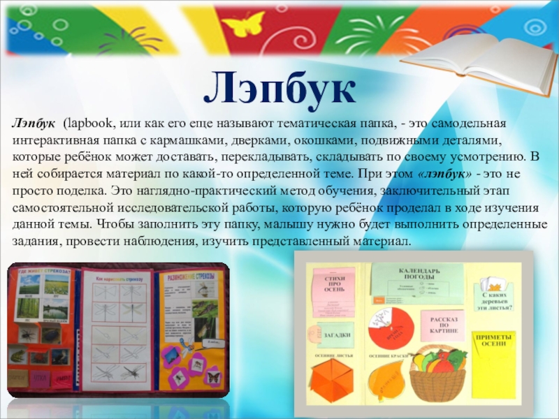 самодельная интерактивная папка с кармашками, дверками, окошками, подвижными деталями, которые ребёнок может доставать, перекладывать, складывать по своему усмотрению. В ней собирается материал по какой-то определенной теме. При этом «лэпбук» - это не просто поделка. Это наглядно-практический метод обучения, заключительный этап самостоятельной исследовательской работы, которую ребёнок проделал в ходе изучения данной темы. Чтобы заполнить эту папку, малышу нужно будет выполнить определенные задания, провести наблюдения, изучить представленный материал.
