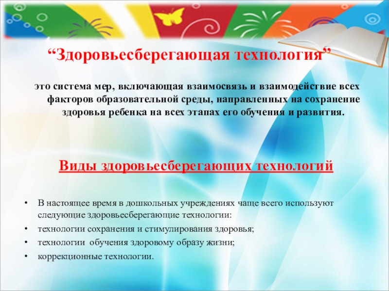 В настоящее время в дошкольных учреждениях чаще всего используют следующие здоровьесберегающие технологии: