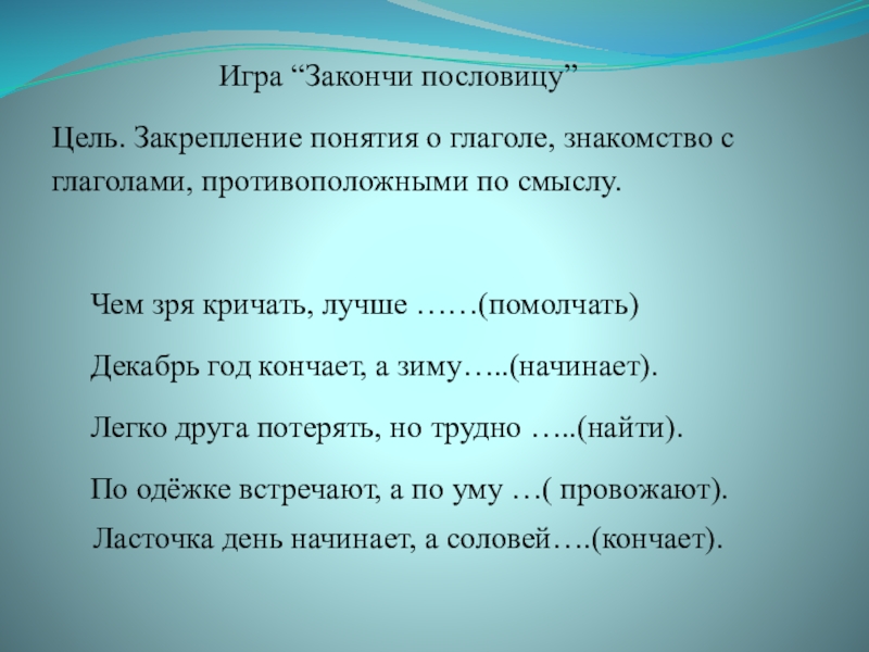 Слайд 10Игра “Закончи пословицу”