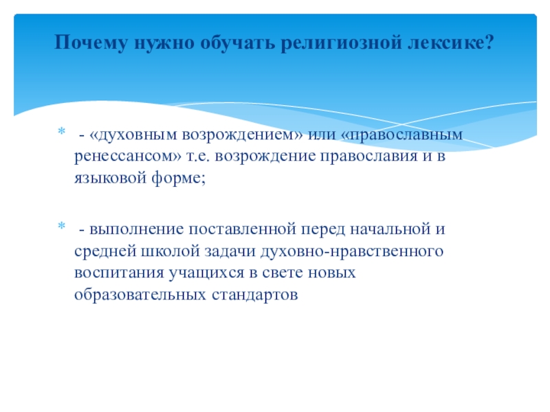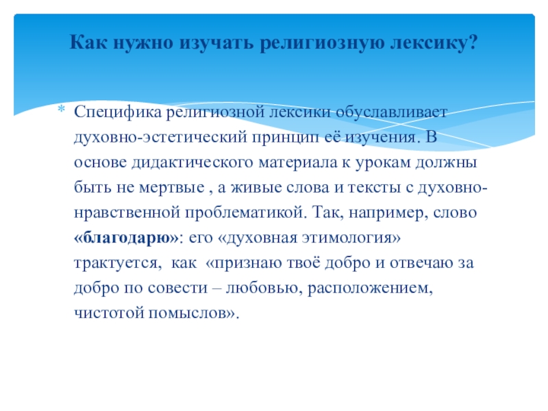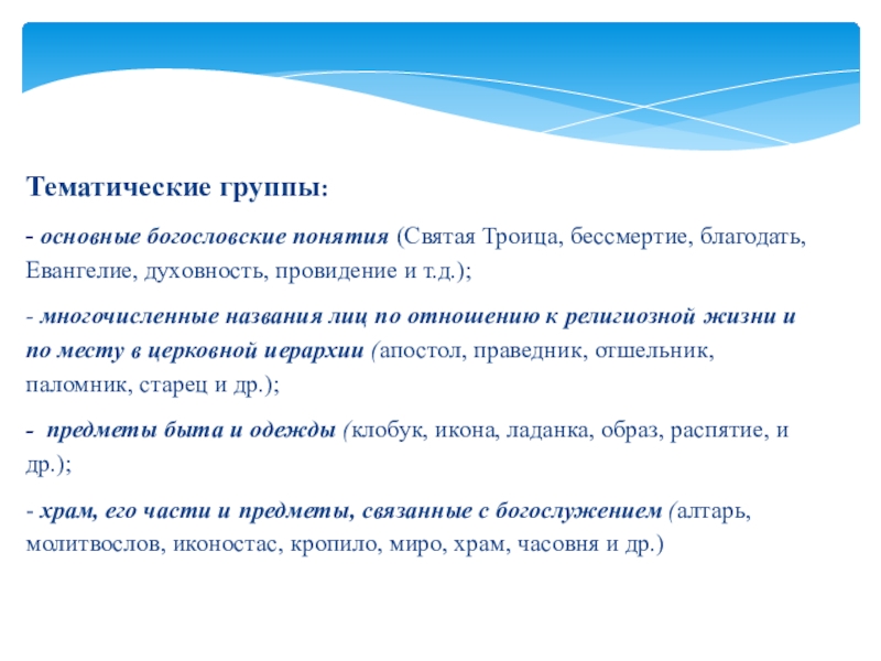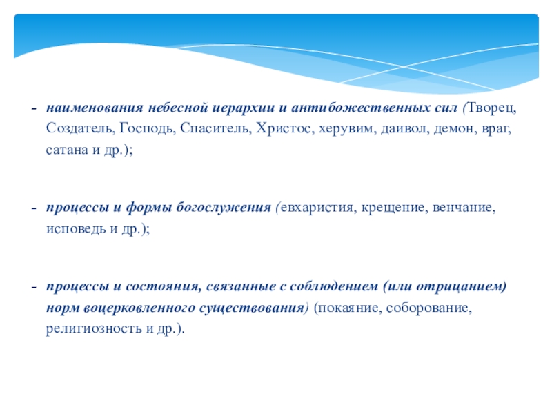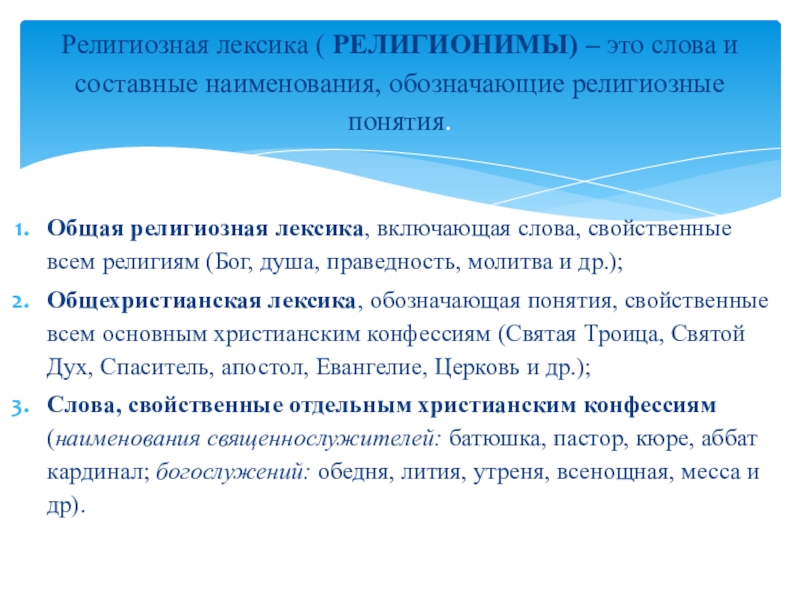 Религиозная лексика ( РЕЛИГИОНИМЫ) – это слова и составные наименования, обозначающие религиозные понятия.