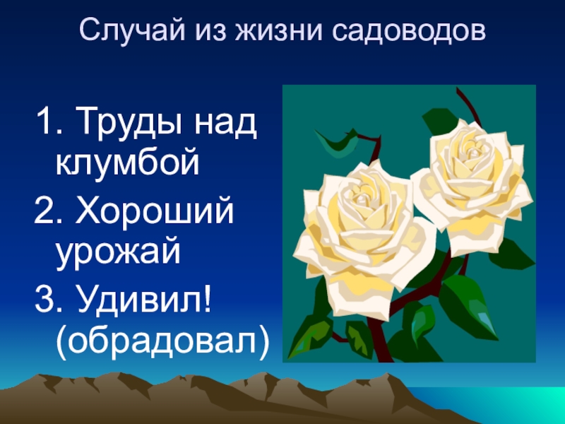 Случай из жизни садоводов 1. Труды над клумбой2. Хороший урожай3. Удивил! (обрадовал)