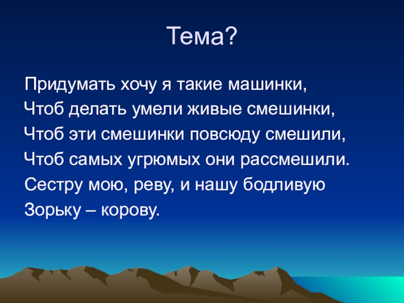 Тема?Придумать хочу я такие машинки,Чтоб делать умели живые смешинки, Чтоб эти смешинки повсюду смешили, Чтоб самых угрюмых они рассмешили.Сестру мою, реву, и нашу бодливуюЗорьку – корову.