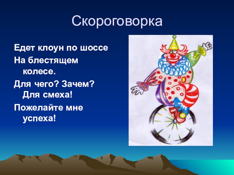 СкороговоркаЕдет клоун по шоссеНа блестящем колесе.Для чего? Зачем? Для смеха!Пожелайте мне успеха!