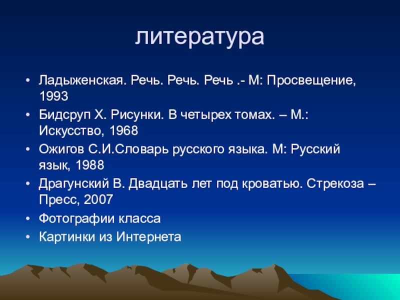 литератураЛадыженская. Речь. Речь. Речь .- М: Просвещение, 1993Бидсруп Х. Рисунки. В четырех томах. – М.: Искусство, 1968Ожигов