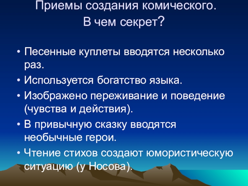 Приемы создания комического.  В чем секрет? Песенные куплеты вводятся несколько раз.Используется богатство языка.Изображено переживание и
