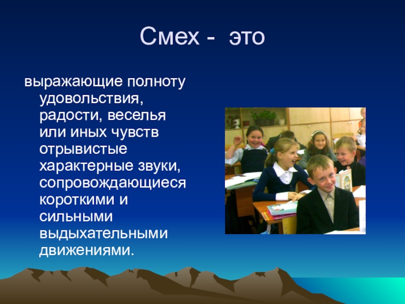 Смех - этовыражающие полноту удовольствия, радости, веселья или иных чувств отрывистые характерные звуки, сопровождающиеся короткими и сильными