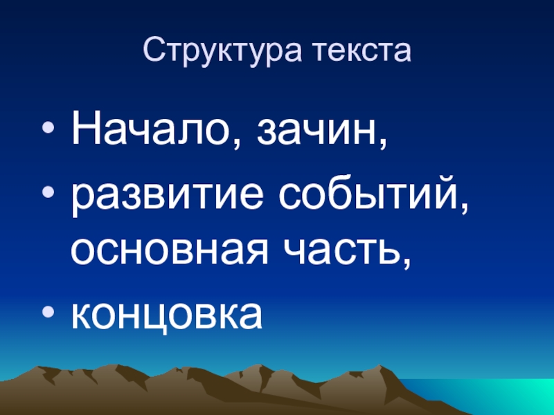 Структура текстаНачало, зачин,развитие событий, основная часть,концовка