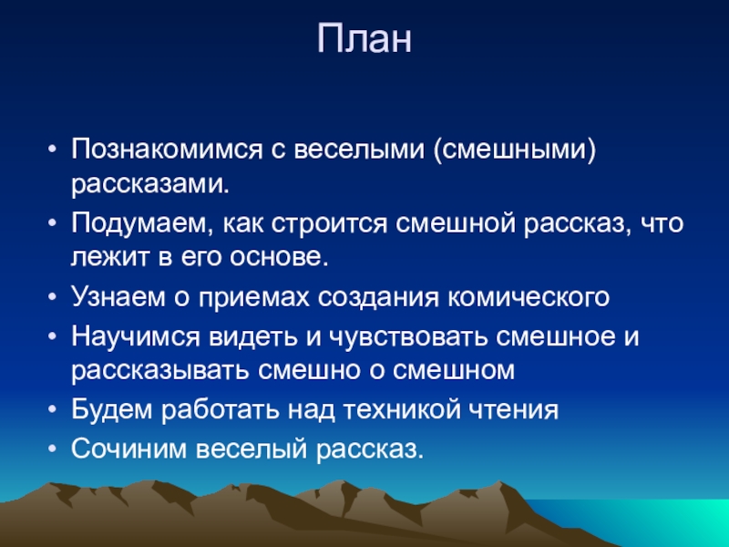 План Познакомимся с веселыми (смешными) рассказами.Подумаем, как строится смешной рассказ, что лежит в его основе.Узнаем о приемах