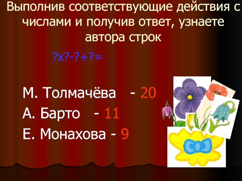 Слайд 12Выполнив соответствующие действия с числами и получив ответ, узнаете автора строк