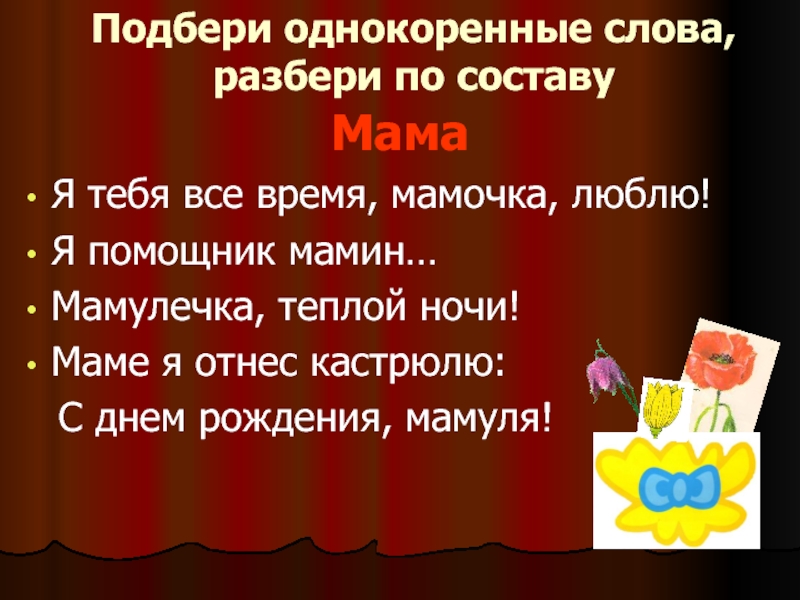 Подбери однокоренные слова, разбери по составуМамаЯ тебя все время, мамочка, люблю!Я помощник мамин…Мамулечка, теплой ночи!Маме я отнес