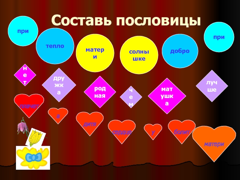 Составь пословицыпритепломатерисолнышкедобропринетдружкароднаячемматушкалучшеплачетадитясердцеуболитматери