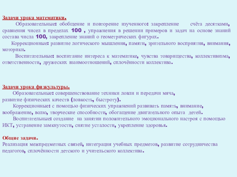 Реализация межпредметных связей, интеграция учебных предметов, развитие сотрудничества педагогов, сплочённости детского и учительского коллектива.