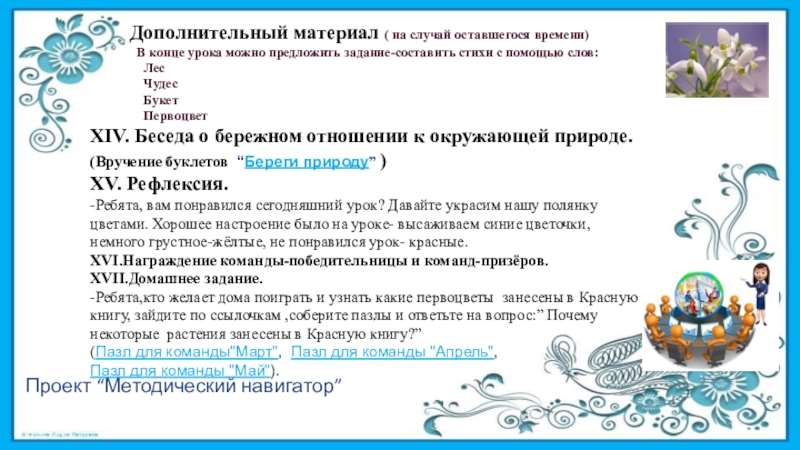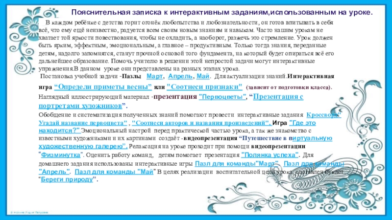 Обобщение и систематизация полученных знаний помогают провести интерактивные задания Кроссворд"Угадай название первоцвета" , "Соотнеси авторов и названия произведений", Игра "Где это находится?" Эмоциональный настрой перед практической частью урока, а так же знакомство с известными художниками и их картинами создаёт -видеопрезентация “Путешествие в виртуальную художественную галерею”. Релаксация на уроке проходит при помощи видеопрезентации “Физминутка”. Оценить работу команд, детям помогает презентация "Полянка успеха". Для домашнего задания использованы интерактивные игры Пазл для команды"Март". Пазл для команды "Апрель". Пазл для команды "Май” В целях реализации воспитательной цели урока, составлен буклет “Береги природу”.