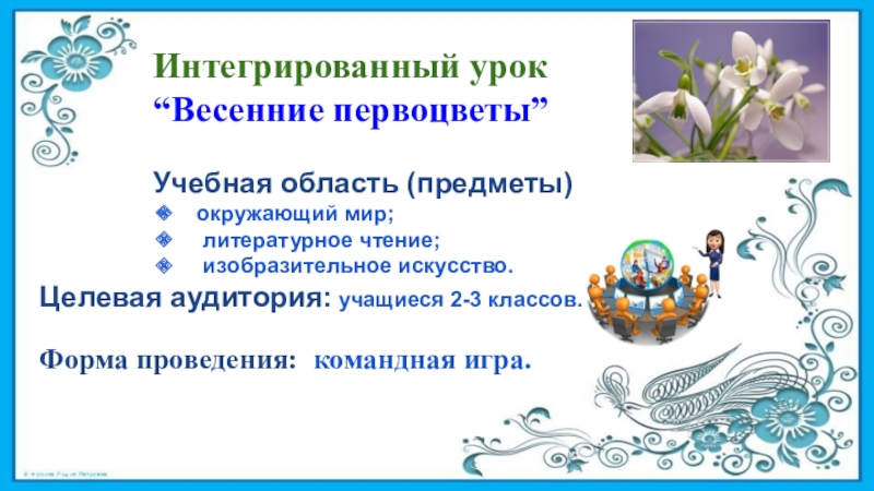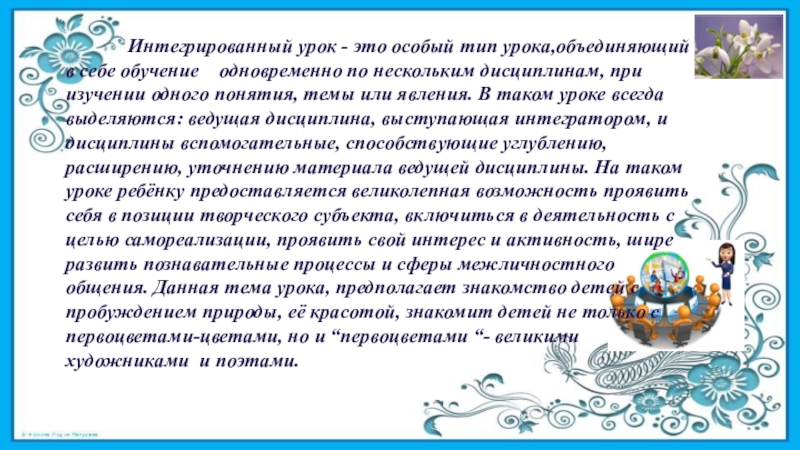 это особый тип урока,объединяющий в себе обучение одновременно по нескольким дисциплинам, при изучении одного понятия, темы или явления. В таком уроке всегда выделяются: ведущая дисциплина, выступающая интегратором, и дисциплины вспомогательные, способствующие углублению, расширению, уточнению материала ведущей дисциплины. На таком уроке ребёнку предоставляется великолепная возможность проявить себя в позиции творческого субъекта, включиться в деятельность с целью самореализации, проявить свой интерес и активность, шире развить познавательные процессы и сферы межличностного общения. Данная тема урока, предполагает знакомство детей с пробуждением природы, её красотой, знакомит детей не только с первоцветами-цветами, но и “первоцветами “- великими художниками и поэтами.